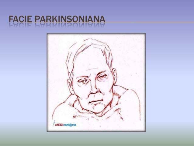 - Facie parkinsoniana: se ve en pacientes con enfermedad de Parkinson. Se caracteriza porque la cara presenta muy poca expresividad (hipomimia) y los pacientes pestañean poco. Ocasionalmente se les puede escurrir un poco de saliva por las comisuras labiales.