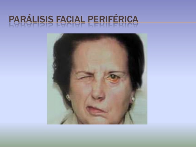- Facies por parálisis facial periférica. Hay hemiatrofia facial, con pérdida de las arrugas de la frente, aumento de la hendidura palpebral, epifora, desviación del ojo y de la comisura labial hacia arriba. Debe diferenciarse de la facies que se observa en la parálisis facial central, en ella no hay compromiso de la frente, excepto en el caso extremo de la lesión bilateral del nervio facial de origen central.