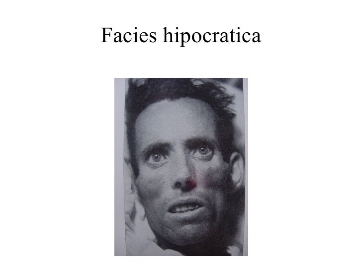 - Facies peritoneal o hipocrática. Mejillas hundidas, nariz afilada, enoftalmos y cianosis en los labios. Se ve en peritonitis aguda, con frecuencia se acompaña de signos evidentes de deshidratación.