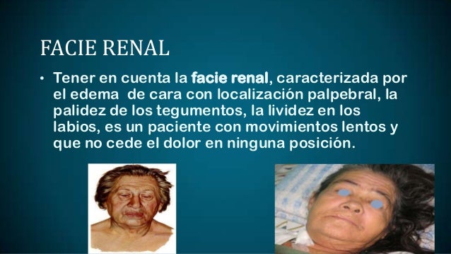 - Facies por nefritis. Se ve en la glomerulonefritis aguda por vasoconstricción y anemia, la cara abotagada, pálida y con edema palpebral.