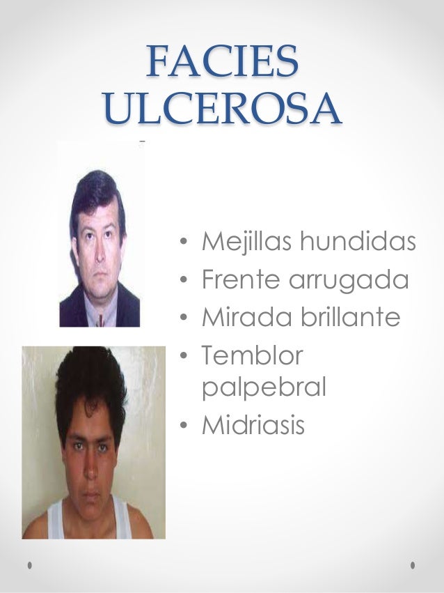 - Facies ulcerosa. Mejillas hundidas, frente arrugada, mirada brillante, temblor palpebral y midriasis.